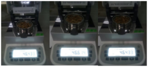 3. 用實驗勺取3g酒糟(93/94)均勻鋪在樣品盤上,設置好合適的溫度后蓋下上蓋,按下“START”鍵開始測試;蜂鳴兩聲后,儀器自動停機,測試結束,可在液晶顯示屏查看測試后酒糟的水含量為46.433%;