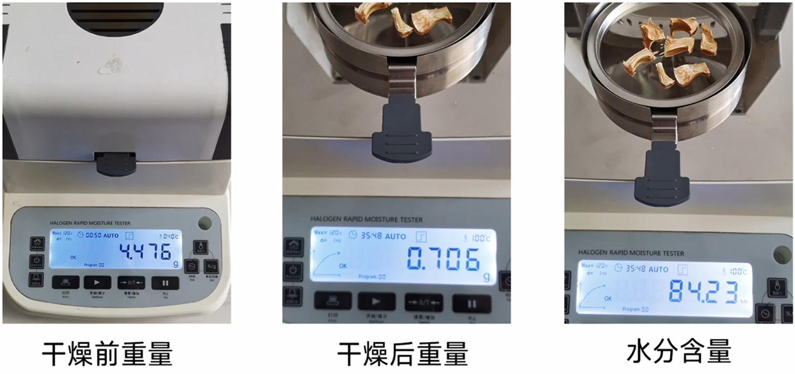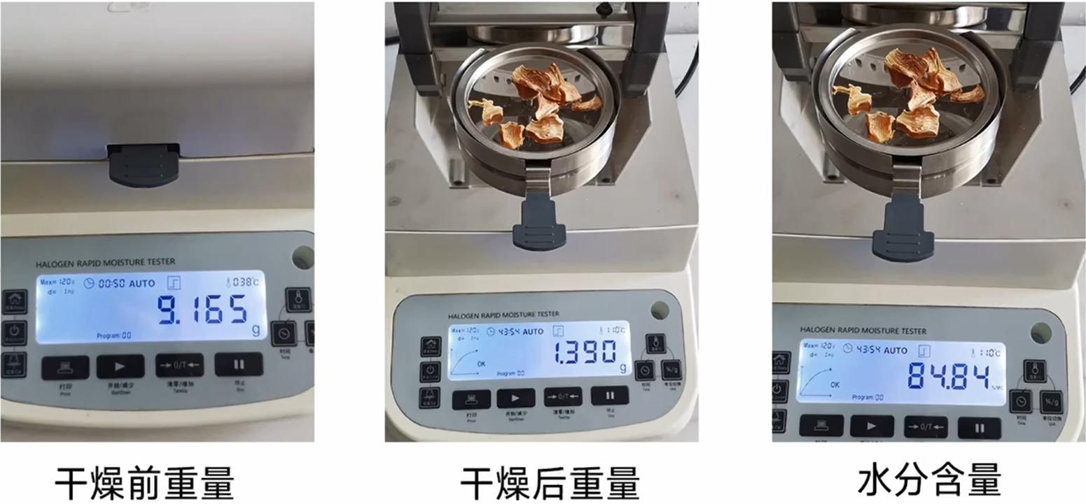 首先將測(cè)量溫度調(diào)整到100℃,然后將筍切成薄片,往樣品盤(pán)里加入3-5g的筍片,蓋上蓋子,等重量數(shù)值穩(wěn)定后按開(kāi)始鍵,儀器開(kāi)始自動(dòng)測(cè)量。