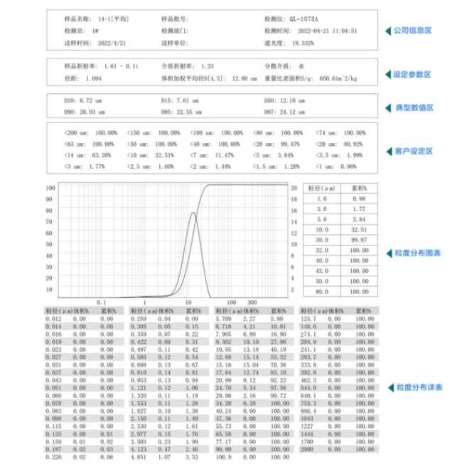 | 顯示模板 | 粒徑區間求百分比,以滿足不同行業對粒度測試的表征方式。徑距、一致性、區間累積等等 | |